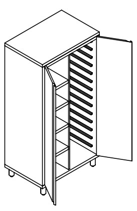 ARMADIO COMBINATO CON 2 ANTE A BATTENTE - PORTATA 20 TEGLIE CARATTERISTICHE » Struttura in acciaio inox AISI 304 18/10 scotch brite anticorrosione e antitaglio; » Struttura formata da ripiano inferiore, piano di copertura, fianchi e schienale; » È possibile aggiungere ulteriori ripiani con omega di rinforzo saldato; » È possibile avere armadi con ante scorrevoli o a battente; » Eventuali richieste superiori ai kg 100 devono essere segnalate in fase d’ordine.