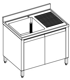 LAVELLO ARMADIATO BATTENTE 1 VASCA CON BASE D'APPOGGIO DX CARATTERISTICHE » Struttura in acciaio inox AISI 304 18/10 scotch brite anticorrosione e antitaglio; » Gambe con tubolare quadro 40x40 scotch brite con piedini regolabili; » Top con alzatina paraspruzzi con vasca inclinata verso lo scarico; » Vasca con fondo insonorizzato; » Dotazione standard: piletta di scarico e troppopieno; » A richiesta: rubinetteria; » Ante con chiusura a scorrevoli o a battente; » Bordo piano mm 40; » Per elementi con alzatina posteriore, le gambe sono rientranti di mm 50.