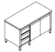 TAVOLO ARMADIATO BATTENTE CON 3 CASSETTI CARATTERISTICHE » Struttura in acciaio inox AISI 304 18/10 scotch brite anticorrosione e antitaglio; » Gambe con tubolare quadro 40x40 con piedini regolabili; » Accessori a richiesta: cassetti, cassettiera, alzatine speciali, ruote etc.; » Piano di lavoro in acciaio inox con angoli saldati; » Alzatina standard completamente saldata; » Ripiano intermedio in acciaio inox con omega di rinforzo; » Bordo piano mm 40; » Guide per cassetto standard; » Per elementi con alzatina posteriore, le gambe sono rientranti di mm 50.