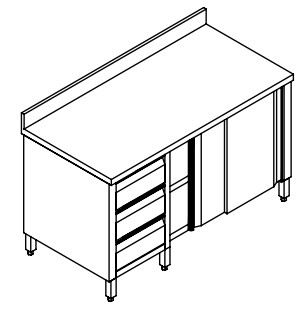 TAVOLO ARMADIATO SCORREVOLE CON ALZATINA E 3 CASSETTI CARATTERISTICHE » Struttura in acciaio inox AISI 304 18/10 scotch brite anticorrosione e antitaglio; » Gambe con tubolare quadro 40x40 con piedini regolabili; » Accessori a richiesta: cassetti, cassettiera, alzatine speciali, ruote etc.; » Piano di lavoro in acciaio inox con angoli saldati; » Alzatina standard completamente saldata; » Ripiano intermedio in acciaio inox con omega di rinforzo; » Bordo piano mm 40; » Guide per cassetto standard; » Per elementi con alzatina posteriore, le gambe sono rientranti di mm 50.